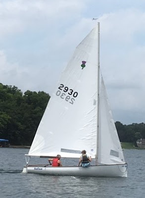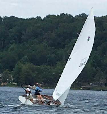 | Jim Riffle, GYC's Encourager-in-Chief, kept watch over the sailors from his pontoon boat in case someone needed help. More on that later. |